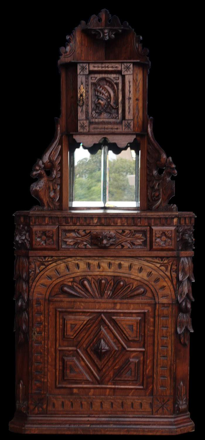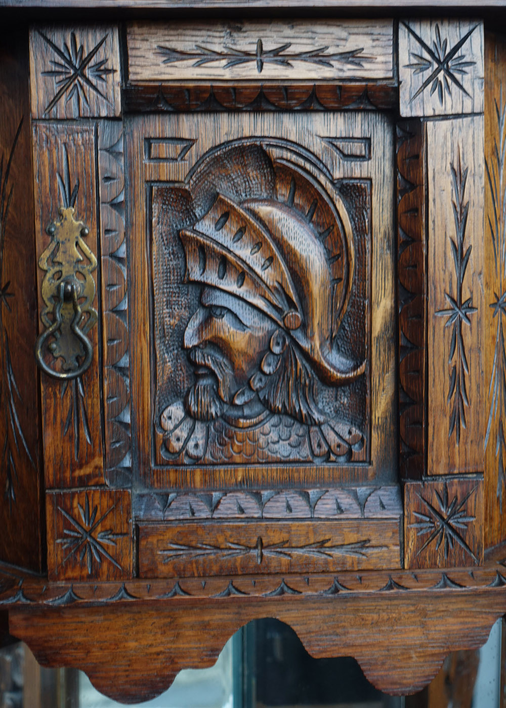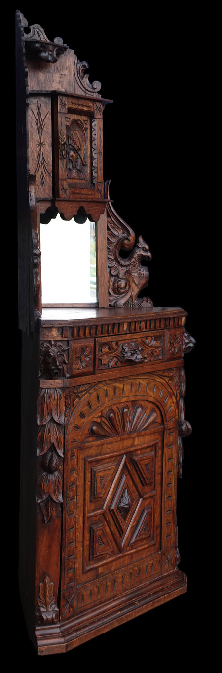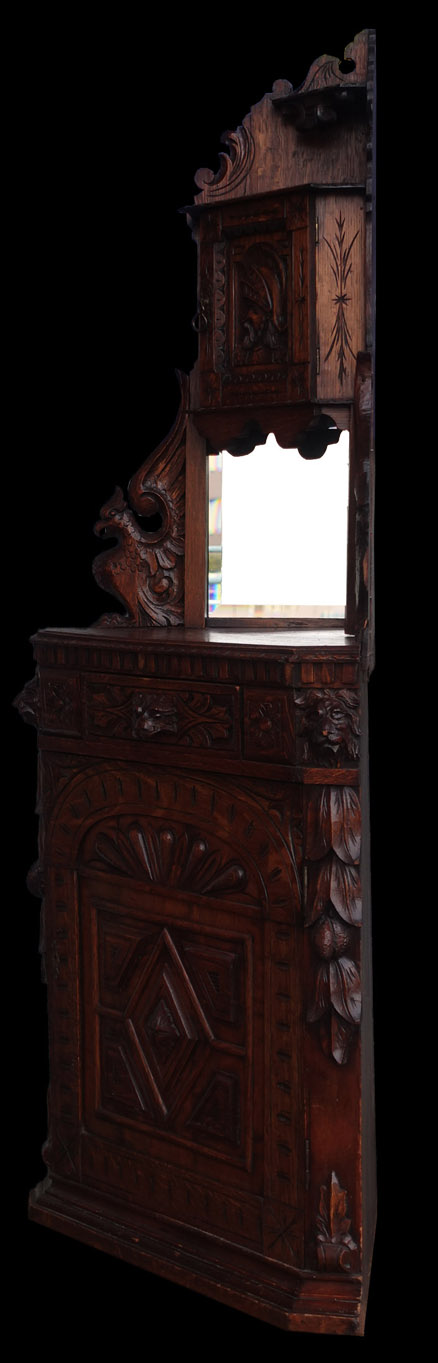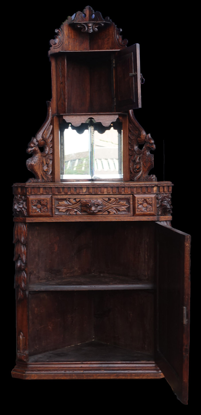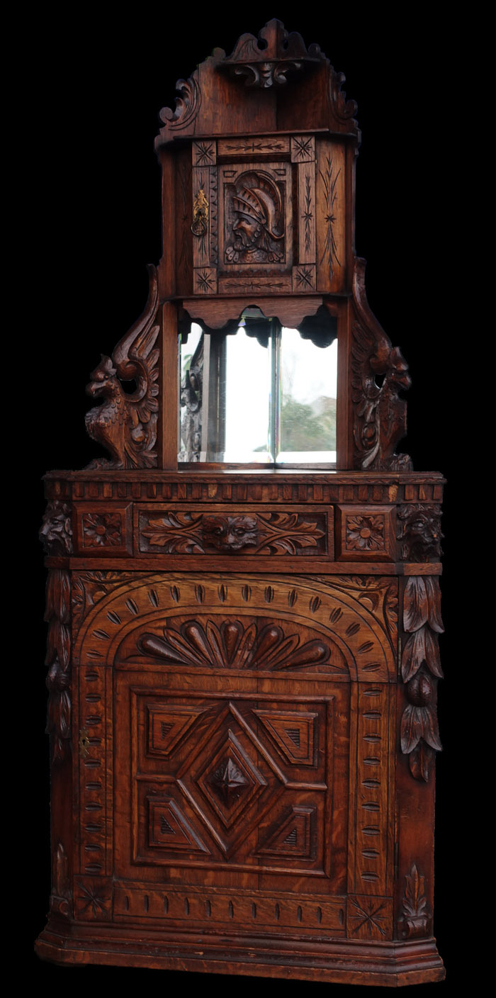 19世紀末に流行した中世からルネサンス期に流行した彫刻のデザインで珍しいコーナーキャビネット。この時期の家具としては小さめで日本の住宅でも使いやすいサイズ。オーク材を使用しておりアンティークならではの素晴らしい彫刻の家具です。