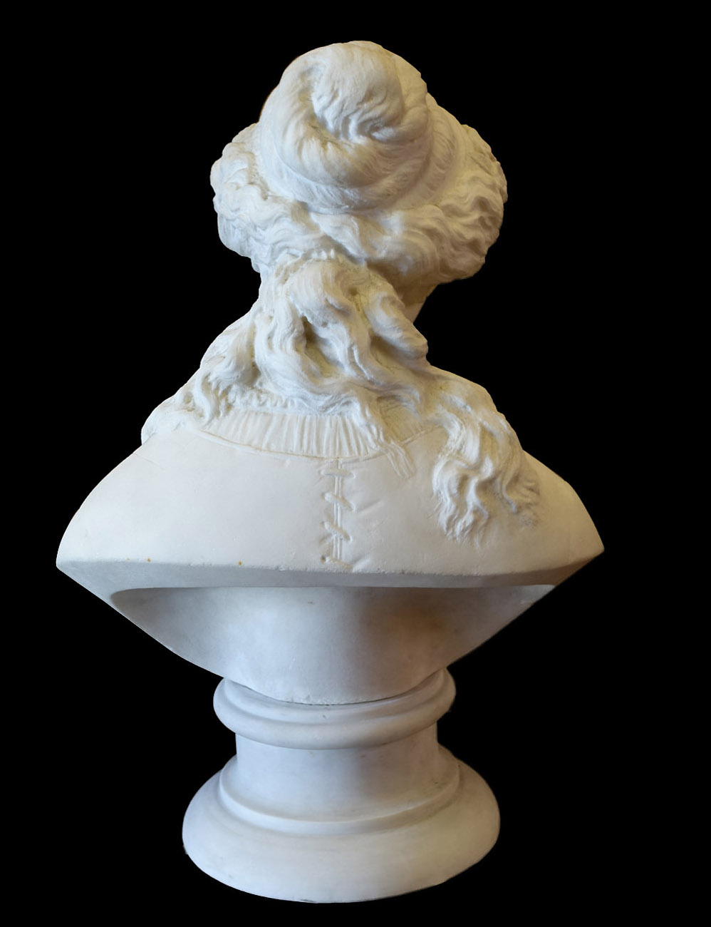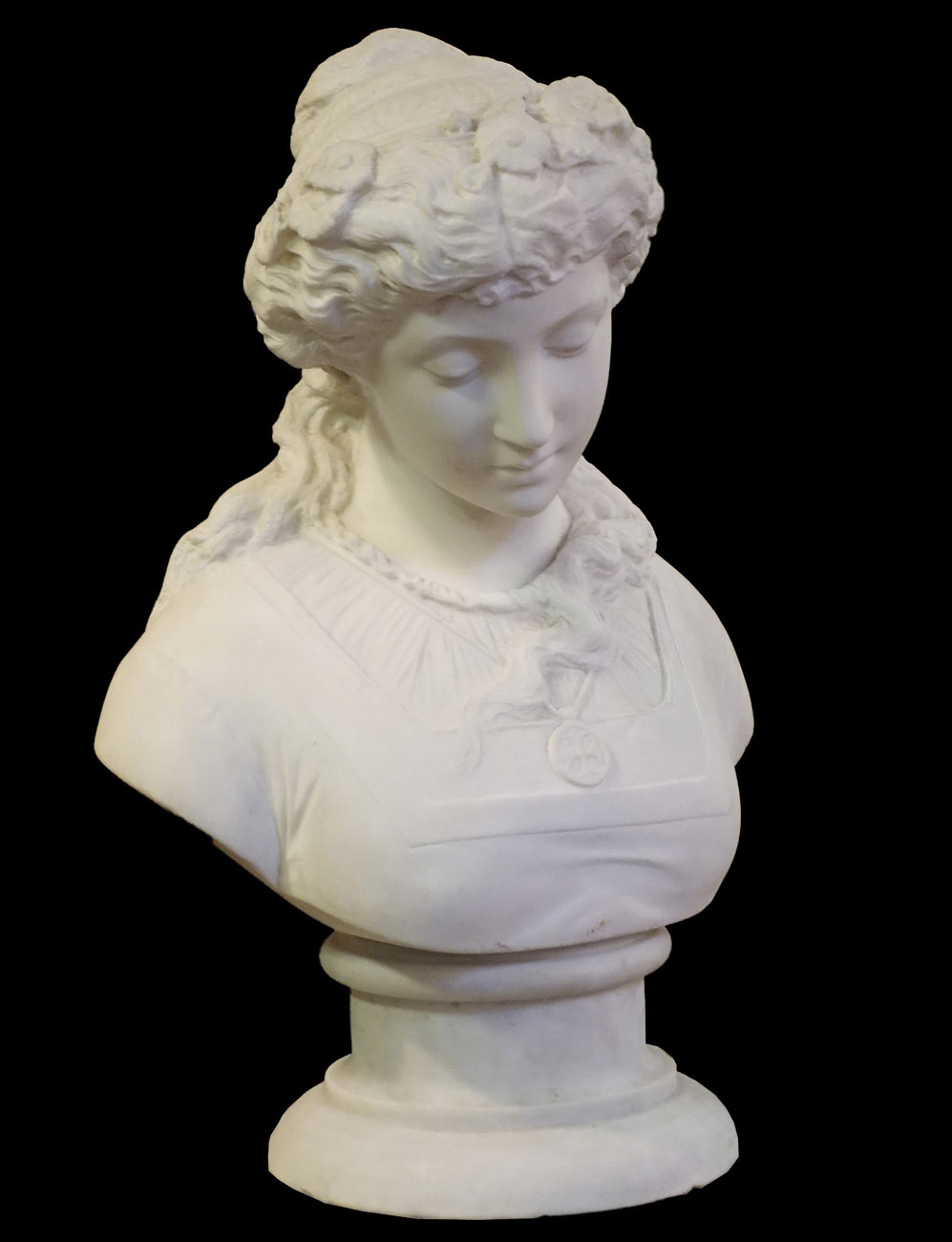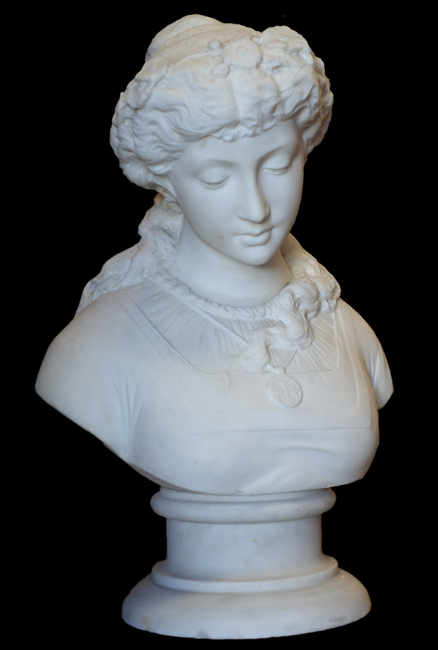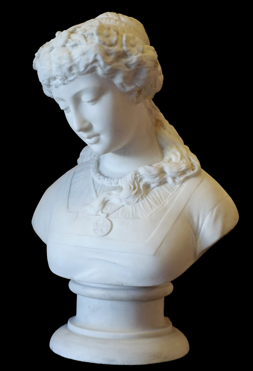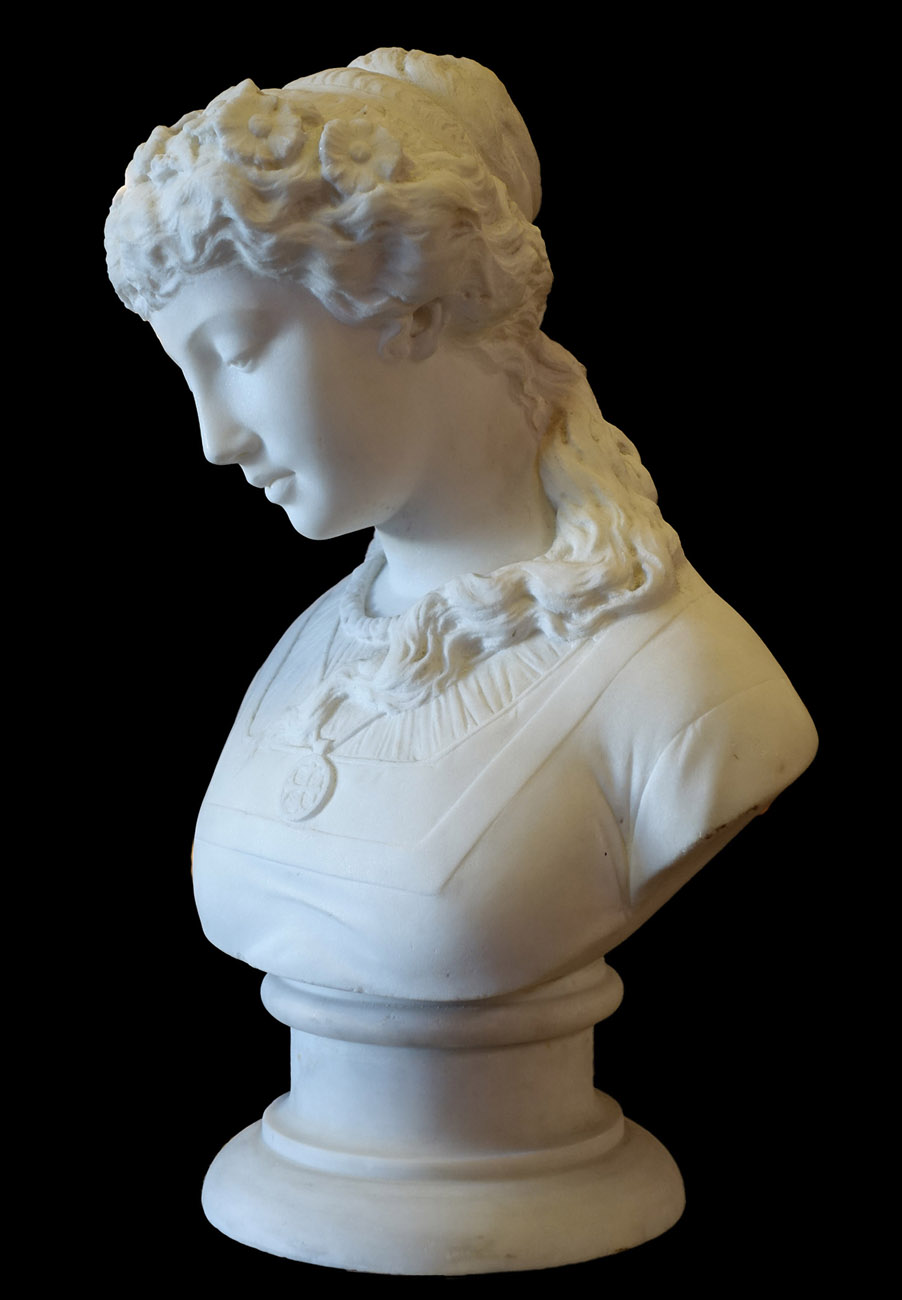 作者や題名などはわかりませんが、小ぶりの胸像なので重量が比較的軽く、細かい部分のつくりなども非常に良くできた大理石彫刻です。おそらく100年ほど前のアンティークだと思われますが。大理石像の場合、通常ブロンズの約3倍の価格が相場ですが、この品は特別価格でお買い得です。