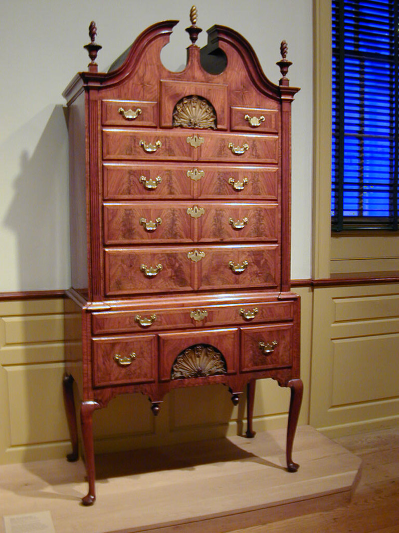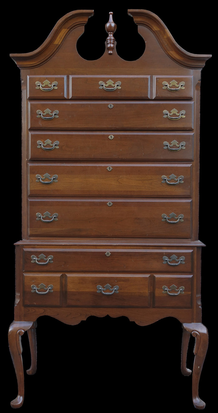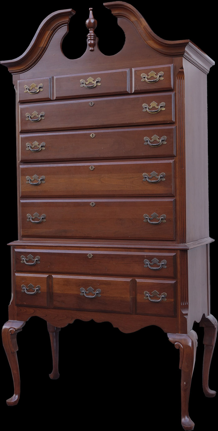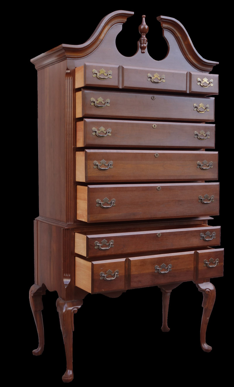 18世紀にアメリカで流行したハイボーイと呼ばれるチェスト。アメリカ独特のン人気のあるチェストでこの品は1990年頃に製作されたもの。アメリカらしく高級なチェリーの無垢材を使用しており、アンティークとして残っていく品質。1730年頃から製作されだしたもので18世紀のものは美術館に展示されている。引き代の多いチェストじゃ日本以外ではあまり製作されていないがこのアメリカの品は現代でも製作されている。